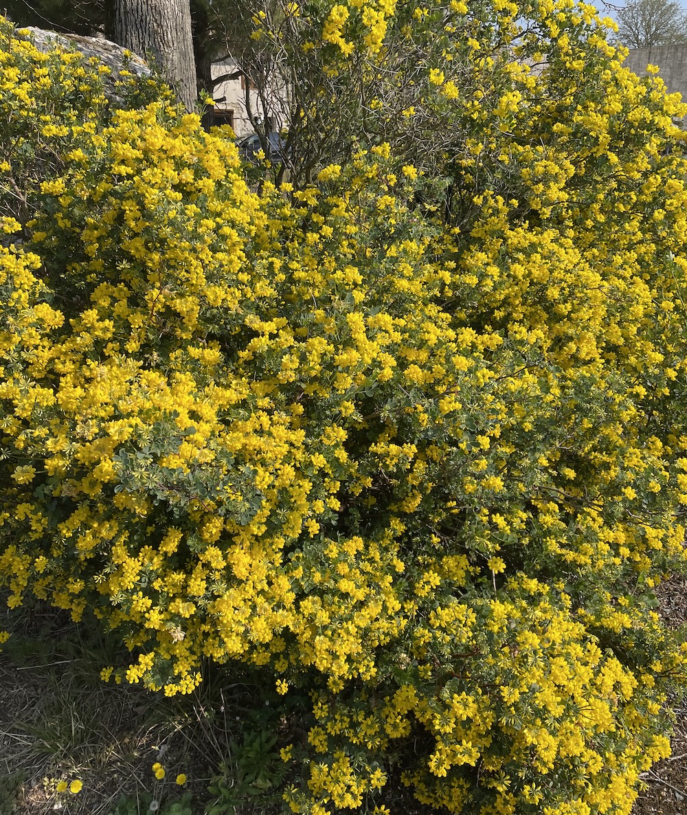 Elle porte au printemps (et parfois dès la fin d’hiver selon le climat) des ombelles de 6 à 12 fleurs papilionacées jaune vif, parfumées, suivies de gousses étroites segmentées.