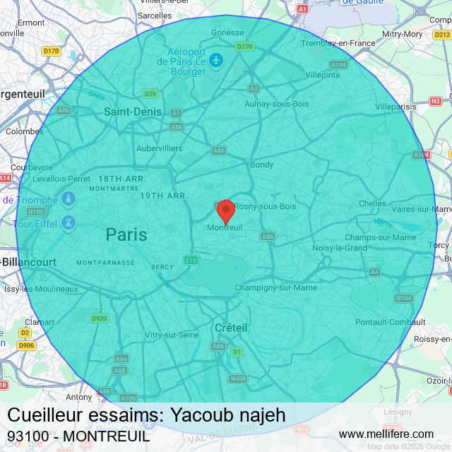 Yacoub najeh intervient dans un rayon de 15 km autour de MONTREUIL avec ces 134 villes voisines :